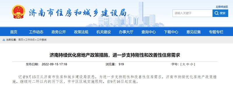央广网济南9月16日消息(记者程立龙 李舜)9月15日,记者从济南市住房和城乡建设局获悉,为进一步支持刚性和改善性住房需求,济南市持续优化房地产政策措施,继续对二环以内的历下区、市中区区域实施限购,自9月16日起实施。