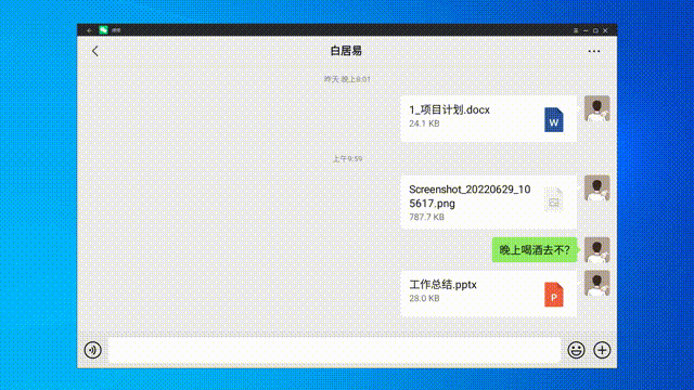 兆懿 1。0 支持支持直接拖拽文件发送给安卓软件联系人,实现传输信息秒级触达。便捷快速的交互设计,更贴近 PC 用户的使用习惯,让自由传递畅行无阻。